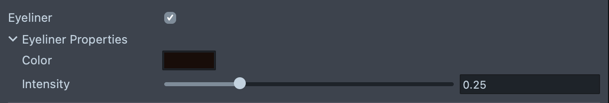 Try playing with the Eyeliner properties. You can adjust the eyeliner’s color and intensity in the same way as in the previous examples.
