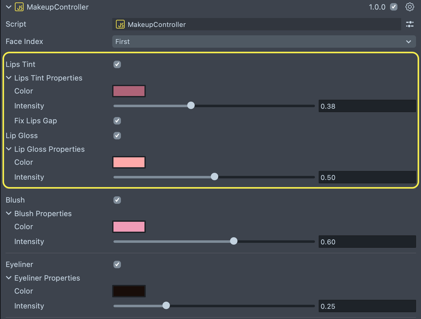 The asset allows you to mix and match different effects to create your personalized makeup. These options are set in the Makeup Controller object. Most effects provide similar options such as: enable or disable, color, and intensity. Take a look at the sections below for additional information on each effect.