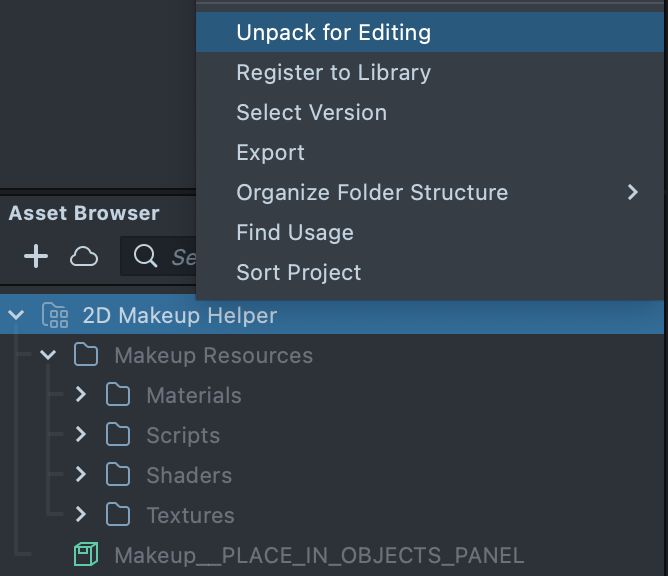 Follow the instructions and drag the prefab Makeup__PLACE_IN_OBJECTS_PANEL into Scene Hierarchy to create a new Scene Object.