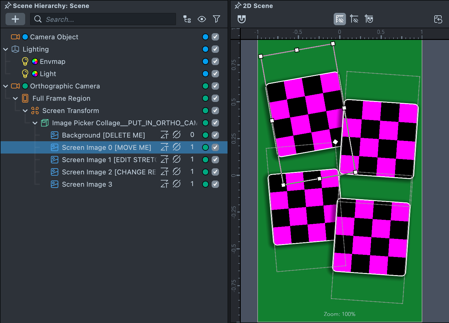 Click on each child of the Image Picker Collage__PUT_IN_ORTHO_CAM and follow the instructions to apply changes. Double click on the child to open 2D Scene panel and move the Screen Image around.