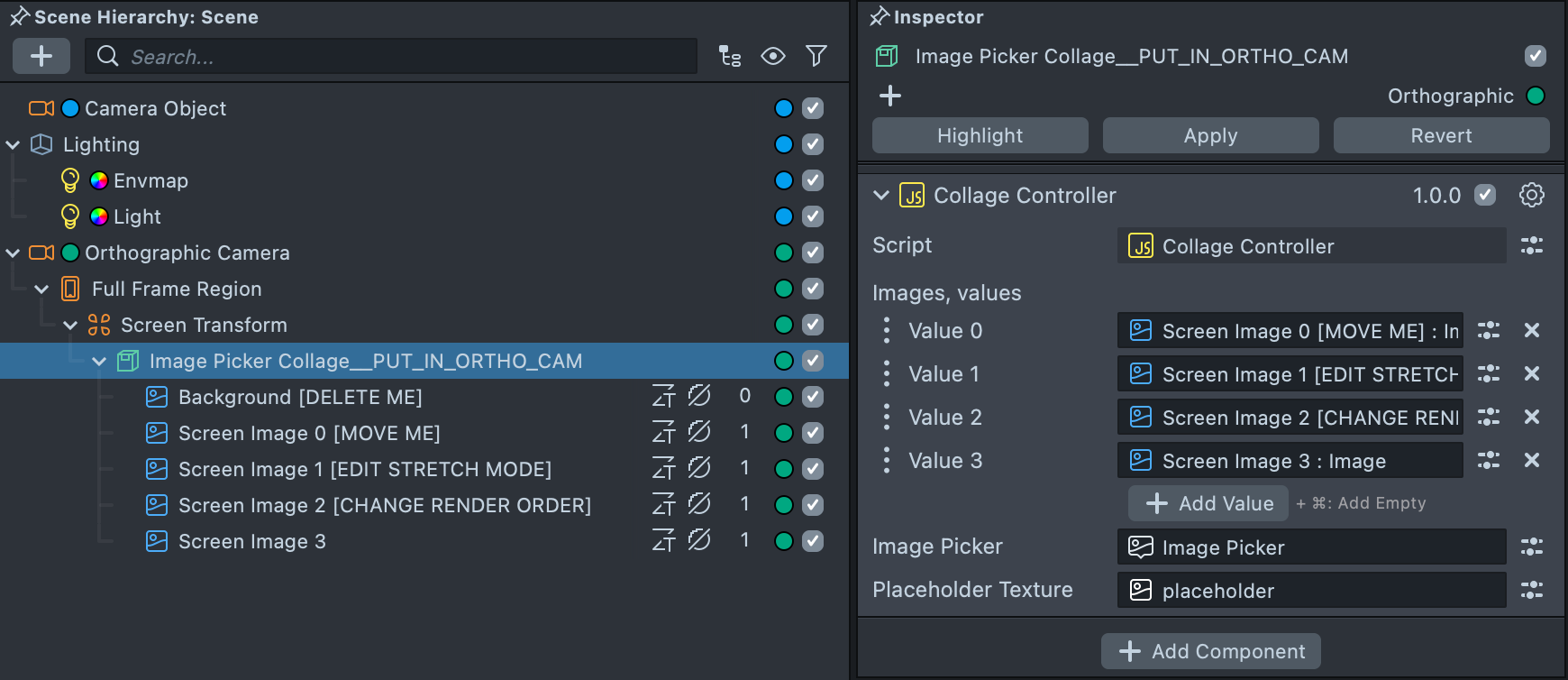 Click on the Image Picker Collage__PUT_IN_ORTHO_CAM to adjust settings in the Inspector panel.