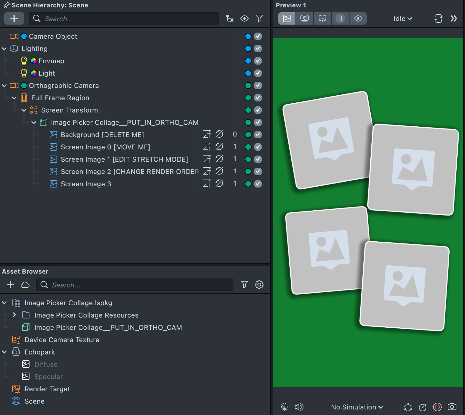 Find the Image Picker Collage asset in the Asset Library and import it into your project. Click here to learn more about how to use assets in the Asset Library. Once you import the asset from Asset Library, you can find the package in the Asset Browser. Follow the instructions and drag the prefab Image Picker Collage into Scene Hierarchy undert Orthgraphic Camera to create a new Scene Object. You can right-click and select Unpack for Editing from the drop-down menu to unpack all assets stored in the bundle.