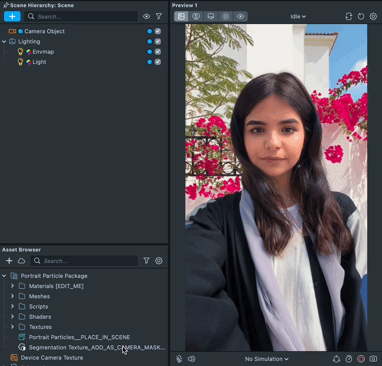 The Portrait Particles asset allows you to create a fun and simple face Lens with particles. The asset features multiple particle presets that you can add behind the user. For further customization, you can also use your own particles.