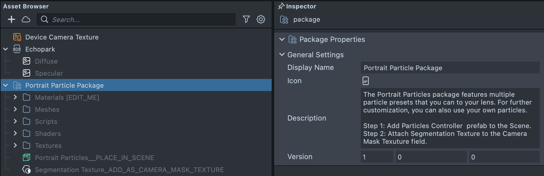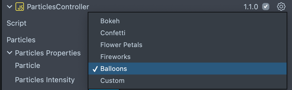To get started, select the ParticlesController [EDIT_ME]] in the Scene Hierarchy panel. You can adjust its settings in the Inspector panel to customize your Lens.