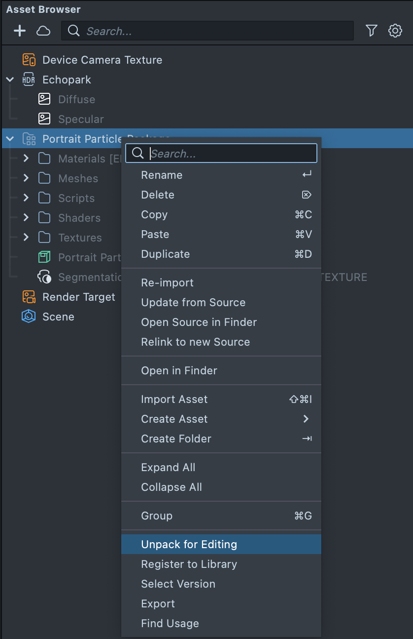You can right-click and select Unpack for Editing from the drop-down menu to unpack all assets stored in the bundle. Click here to learn more about Asset Packages. Once you unpack the package, you can then edit its content.