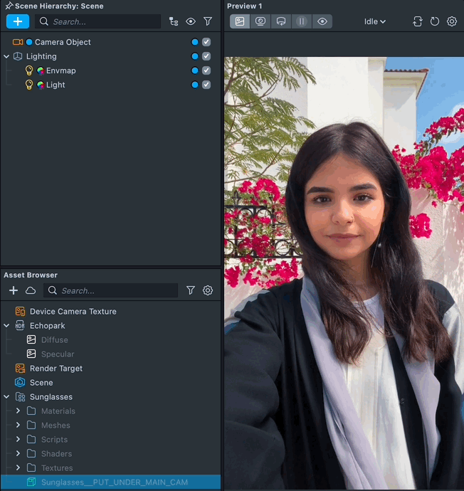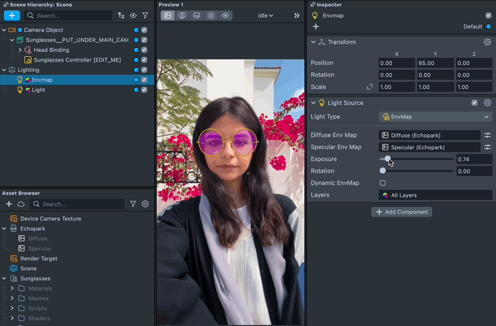 Edit the custom reflection’s texture by changing the Reflection Texture property to your own custom texture. To import a custom texture into Lens Studio, select + -> Import Files in the Asset Browser panel. Adjust the Reflection Intensity slider to define how prominent your custom reflection is.