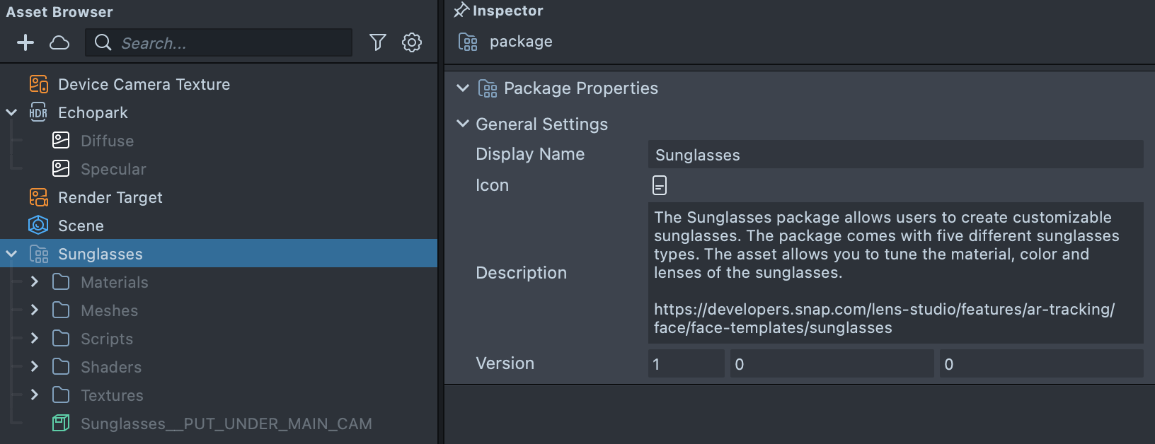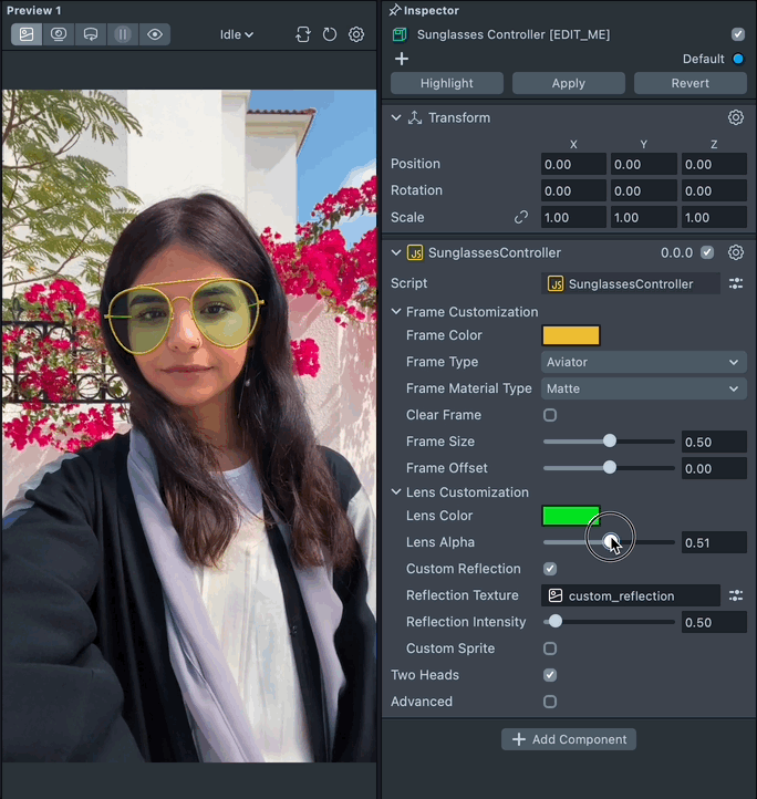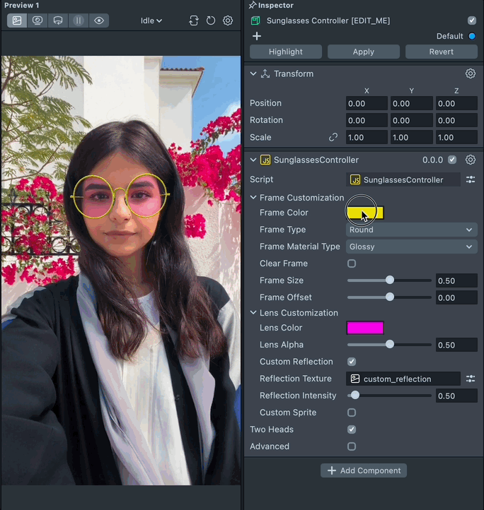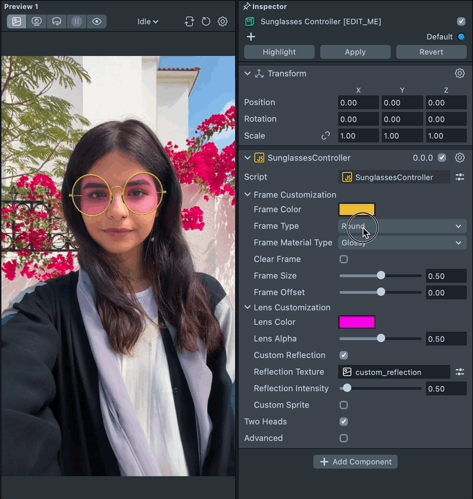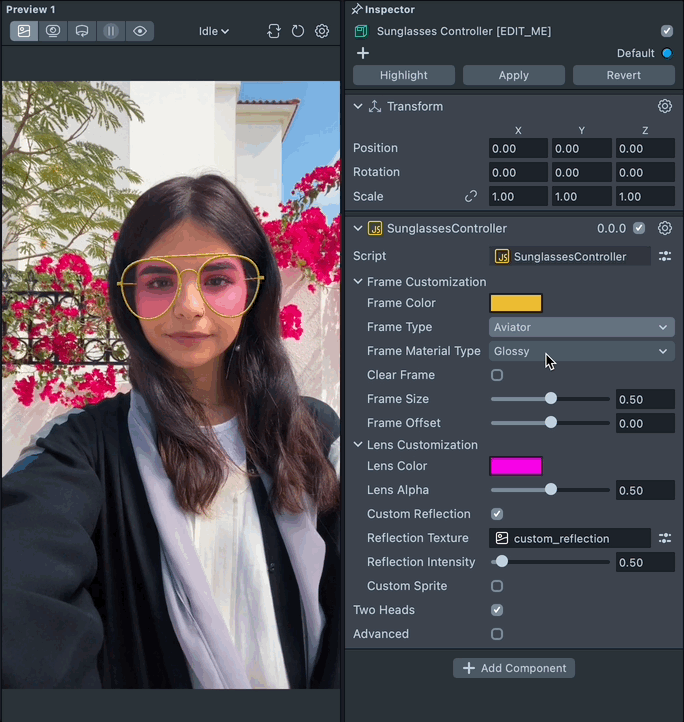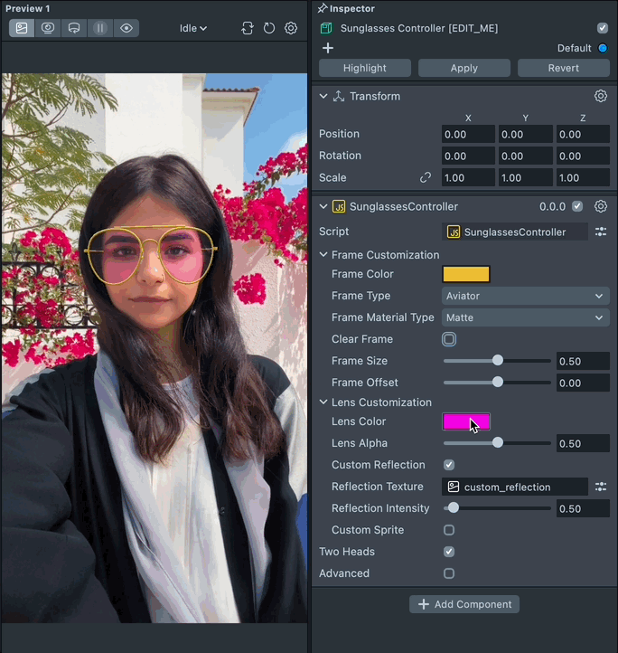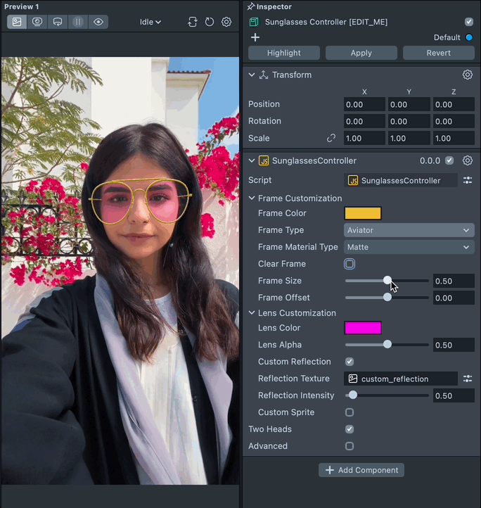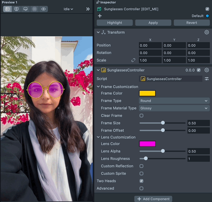 To customize the sunglasses, select the Sunglasses Controller [EDIT_ME] object in the Scene Hierarchy panel and adjust its settings in the Inspector panel.