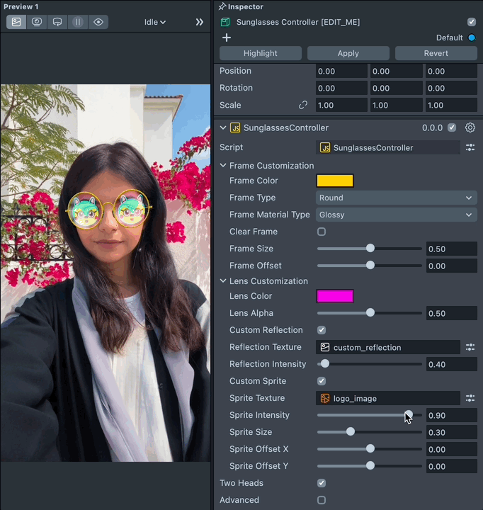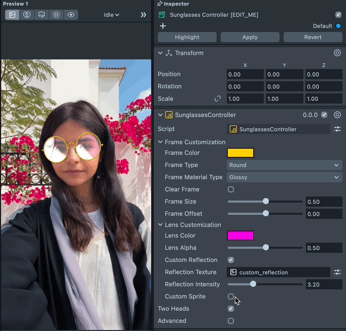 The Sunglasses controller supports two heads wearing the same sunglasses. To enable two head support, check the Two Heads checkbox.