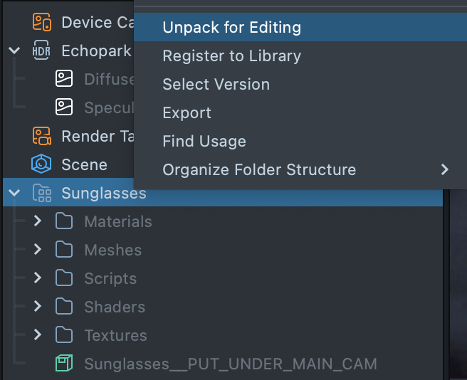 Follow the instructions and drag the prefab Sunglasses__PUT_UNDER_MAIN_CAM into Scene Hierarchy to create a new Scene Object.