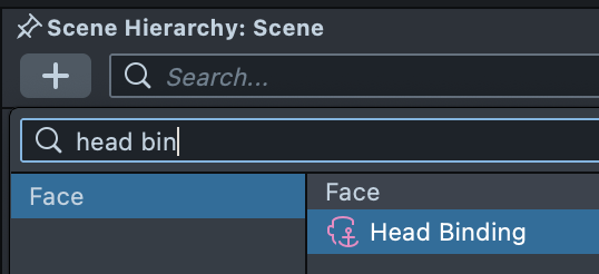 A 3D object is attached to the face using a Head Binding object. To create a Head Binding, in your Scene Hierarchy panel select: + -> Face -> Head Binding.