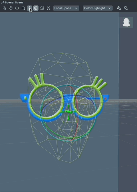 Use the Move, Rotation, and Scale tool at top of the Scene Panel to change the transform of your 3D objects in relation to the head binding.