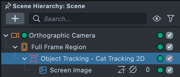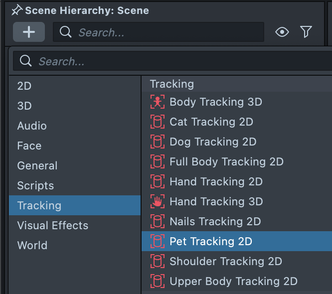 To add Object Tracking to your project, in the Scene Hierarchy panel, select + -> Tracking and the type of Object Tracking you'd like to use.