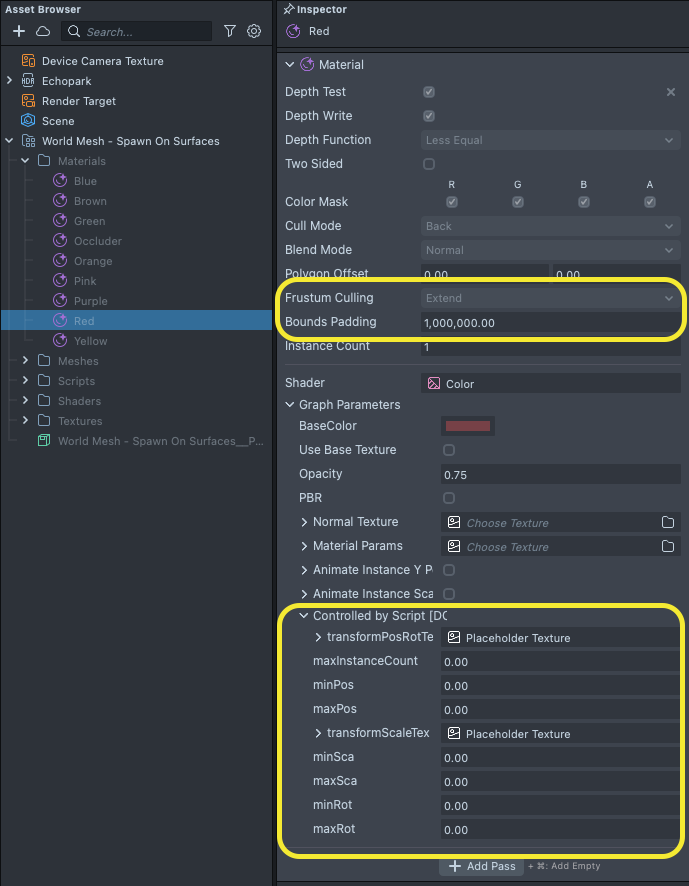 These Graph materials are unique in that they have their Frustum Culling with Extend option with a large padding so that they don’t disappear when you look away from their origin (since the instantiation can be anywhere), and have parameters that are passed in through the script which describes where they should be instantiated.