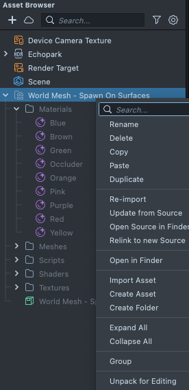 You can right-click on the World Mesh - Spawn On Surfaces asset in the Asset Browser panel, and select Unpack for Editing from the drop-down menu to unpack all assets stored in the bundle. Click here to learn more about Asset Packages. Once you unpack the package, you can then edit its content.