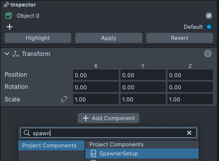 Then select the new object, and in the Inspector panel, press Add Component > SpawnerSetup script