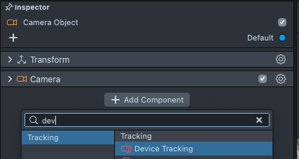 In the Objects panel, select Camera. Then, in the Inspector panel press Add Component -> Device Tracking.