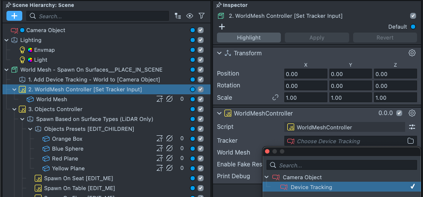 Finally, we will tell our spawner about this component. In the Scene Hierarchy panel, select 2. WorldMesh Controller [Set Tracker Input]. Then, in the Inspector panel, click on the Tracker field, and choose the newly added Device Tracking component.