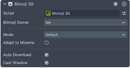 - Auto Download - Whether the Bitmoji should be downloaded when the Lens starts.