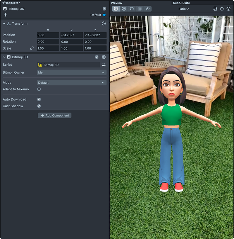 For an easy, no-code approach, you may use a Bitmoji 3D component. This component allows you to easily download the 3D avatar of a Snapchat user, their friends, or their AI assistant, and add it to the scene.