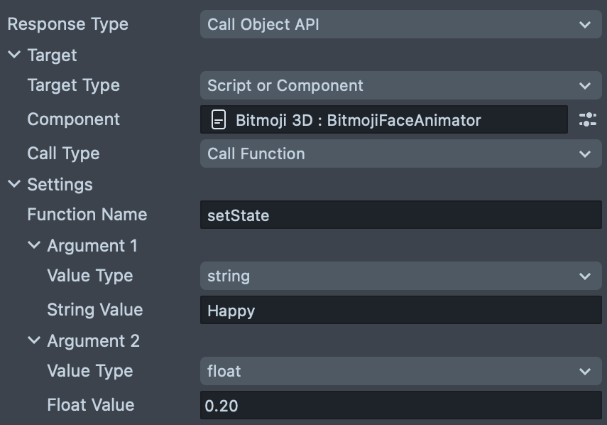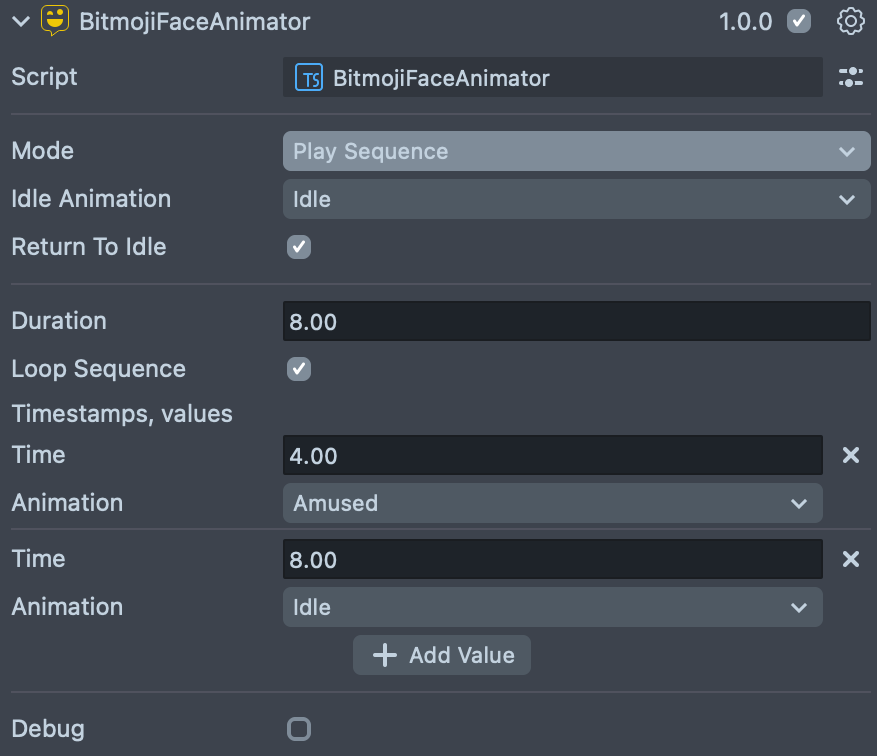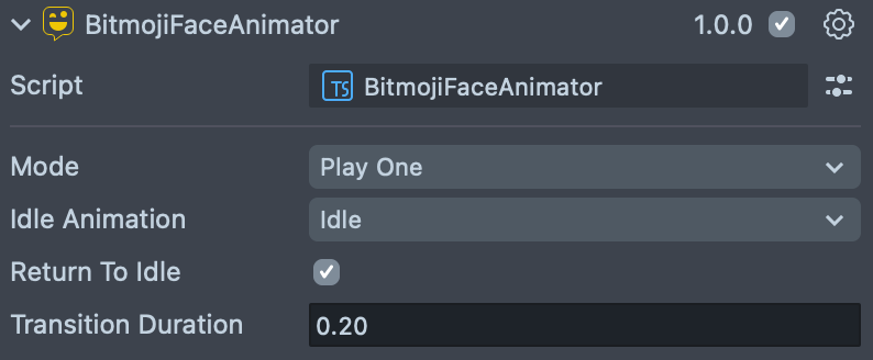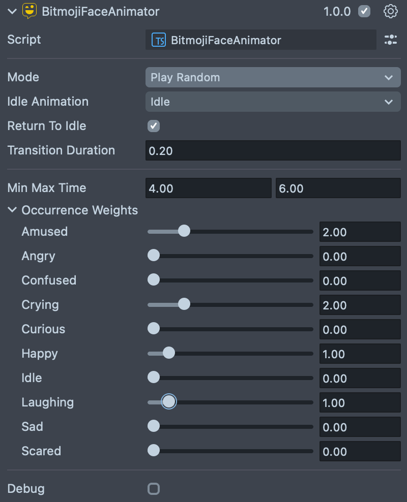The BitmojiFaceAnimator is a component designed to manage and animate a Bitmoji avatar's face through various predefined states. This component allows for the configuration of animation sequences, random animations, and explicit state transitions. Supported animation states are: Idle, Happy, Laughing, Angry, Confused, Amused, Curious, Scared, Sad, Crying. The component takes care of smooth blending between these animations.