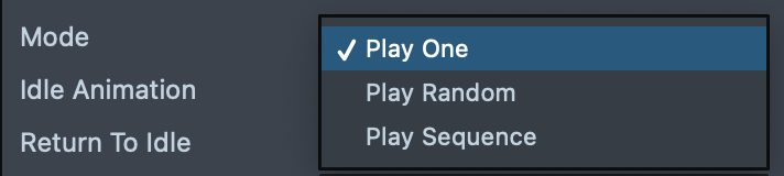 • Play One: Plays a selected animation in a loop. This mode allows other animations to be triggered through the component API. Select the animation to play by default using the Idle Animation input.