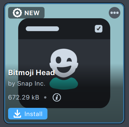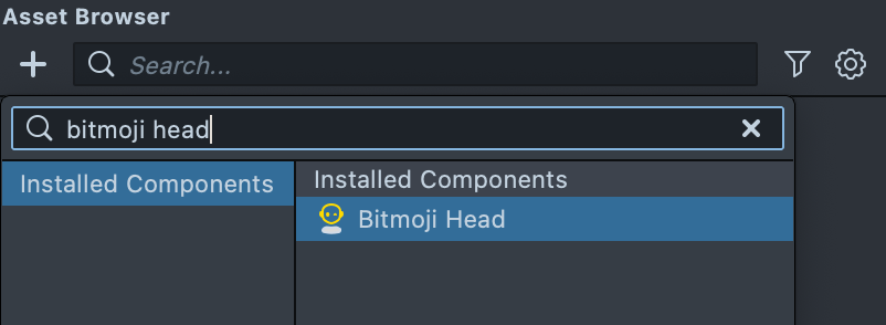 The Bitmoji Head custom component is available in LS Asset Library. To install, click Install or Update, then add it to the Asset Browser panel by clicking the + button and searching for Bitmoji Head.