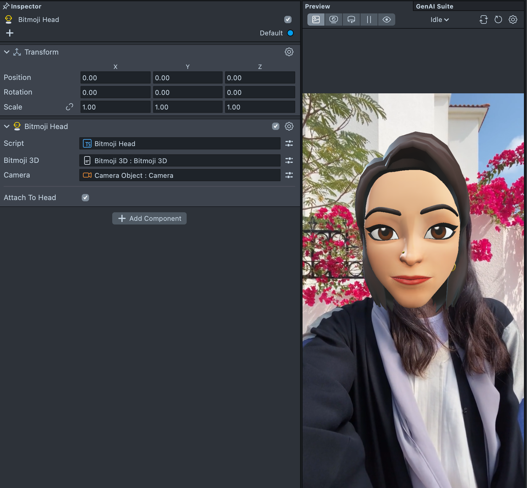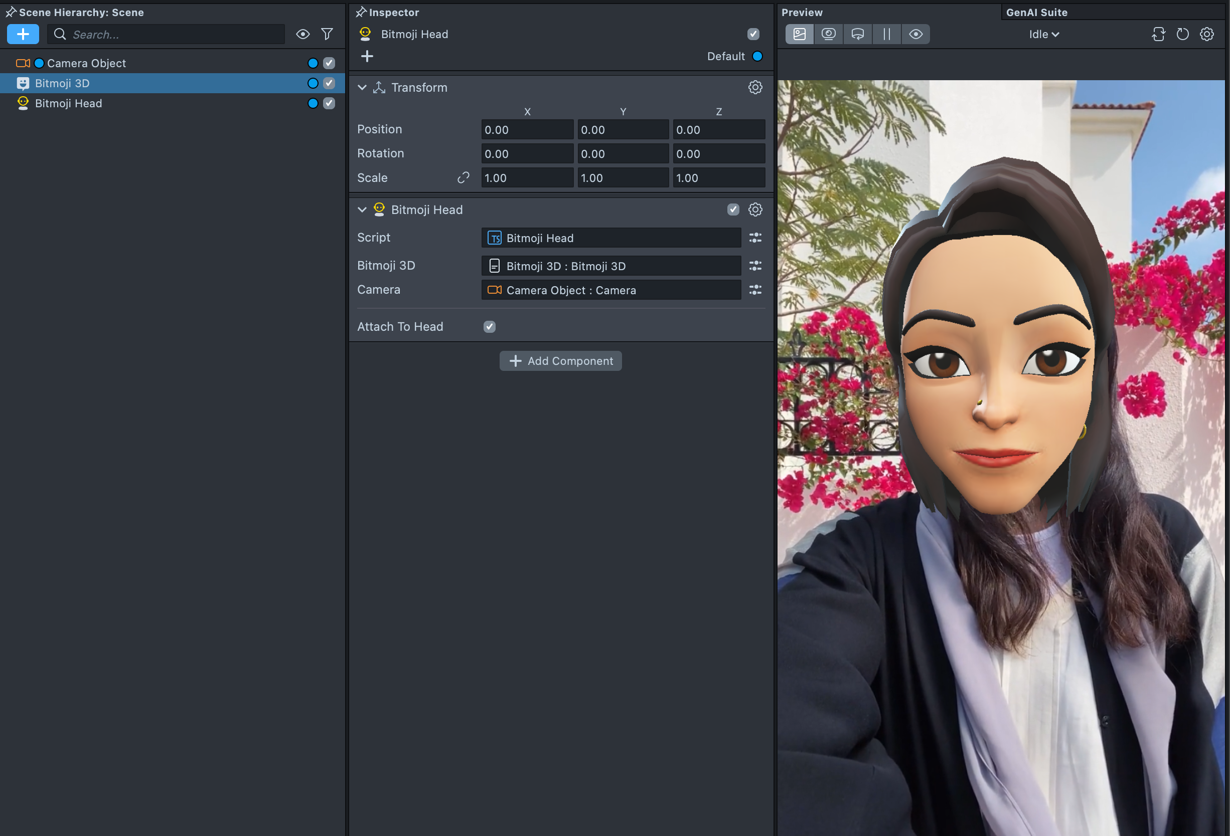 Drag and drop the Bitmoji Head asset into the Scene Hierarchy panel to create a new scene object with the necessary components attached.