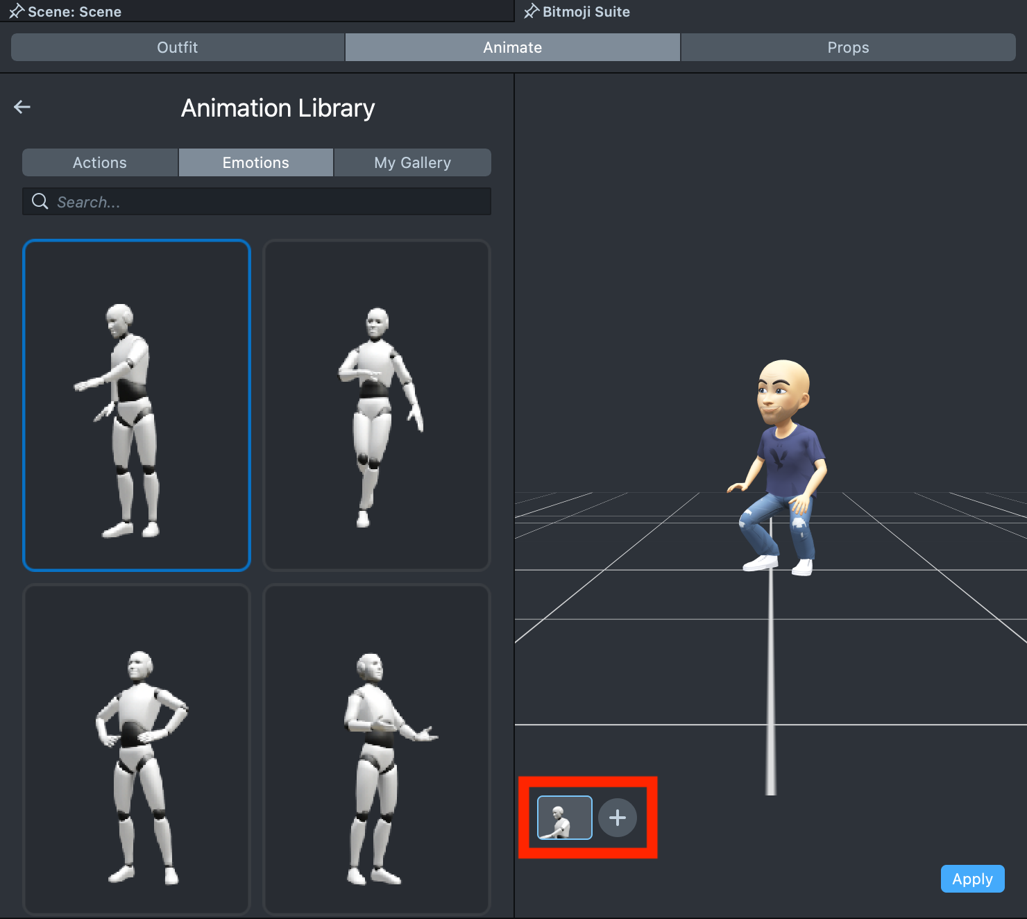 Select the first animation in the library that you’d like to stitch. A tiny preview of the animation will appear in the lower corner of the scene, along with a + button.