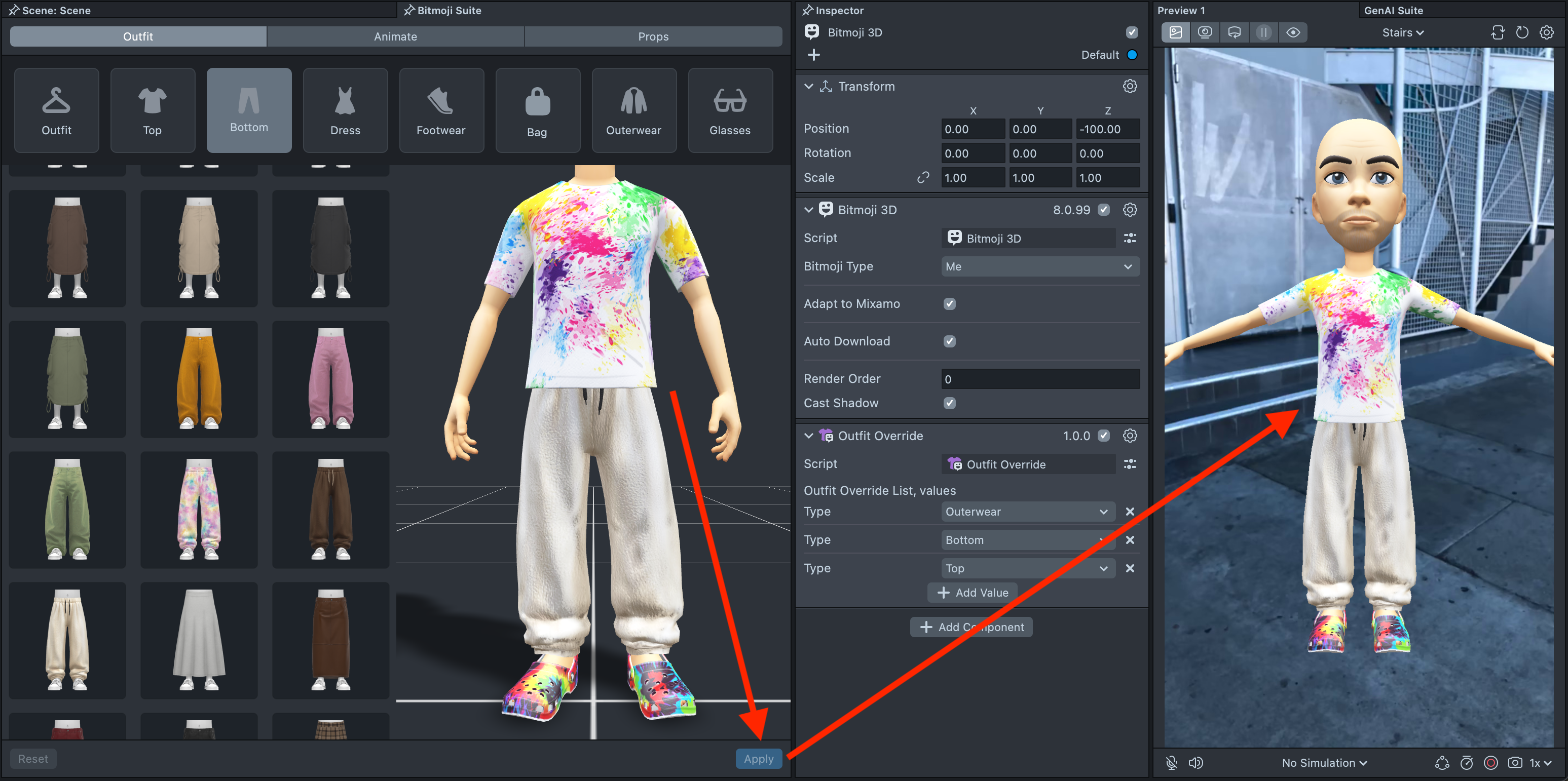 Select the Bitmoji in the Scene Hierarchy that you want to apply the copied outfit to