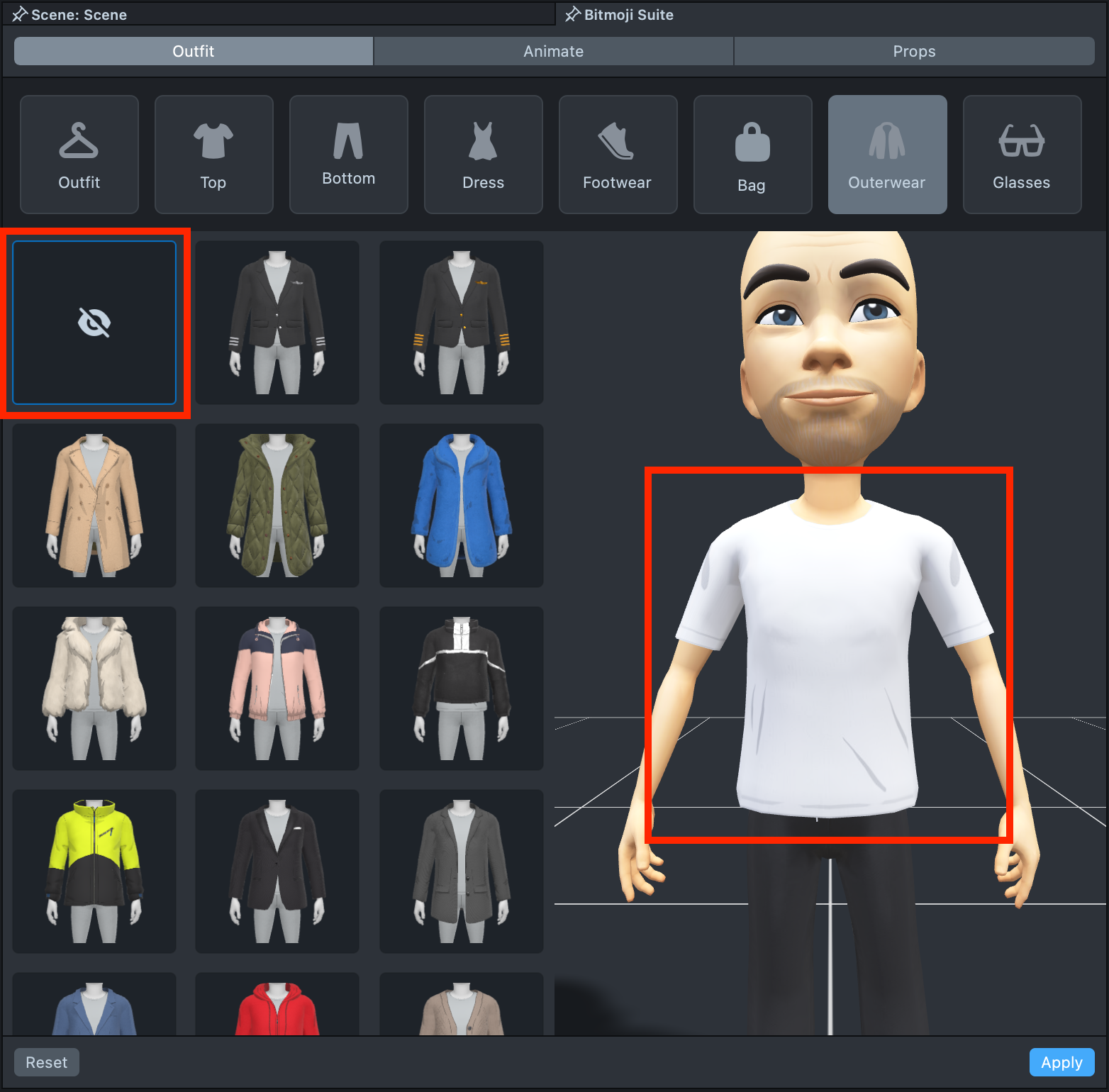 Choose the Outfit tab in the Bitmoji Suite (To learn how to find Bitmoji Suite, go to the Overview).