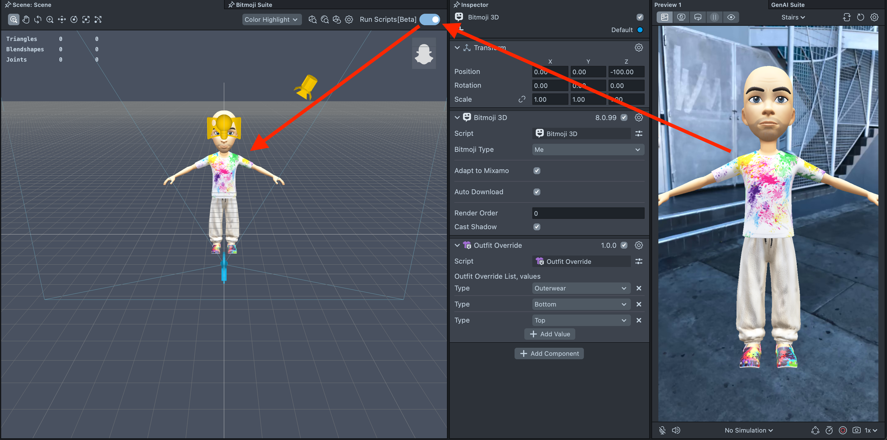 To view your Bitmoji in the Scene panel and interact with it, you need to enable the Run Scripts[Beta] toggle. This feature is turned off by default.