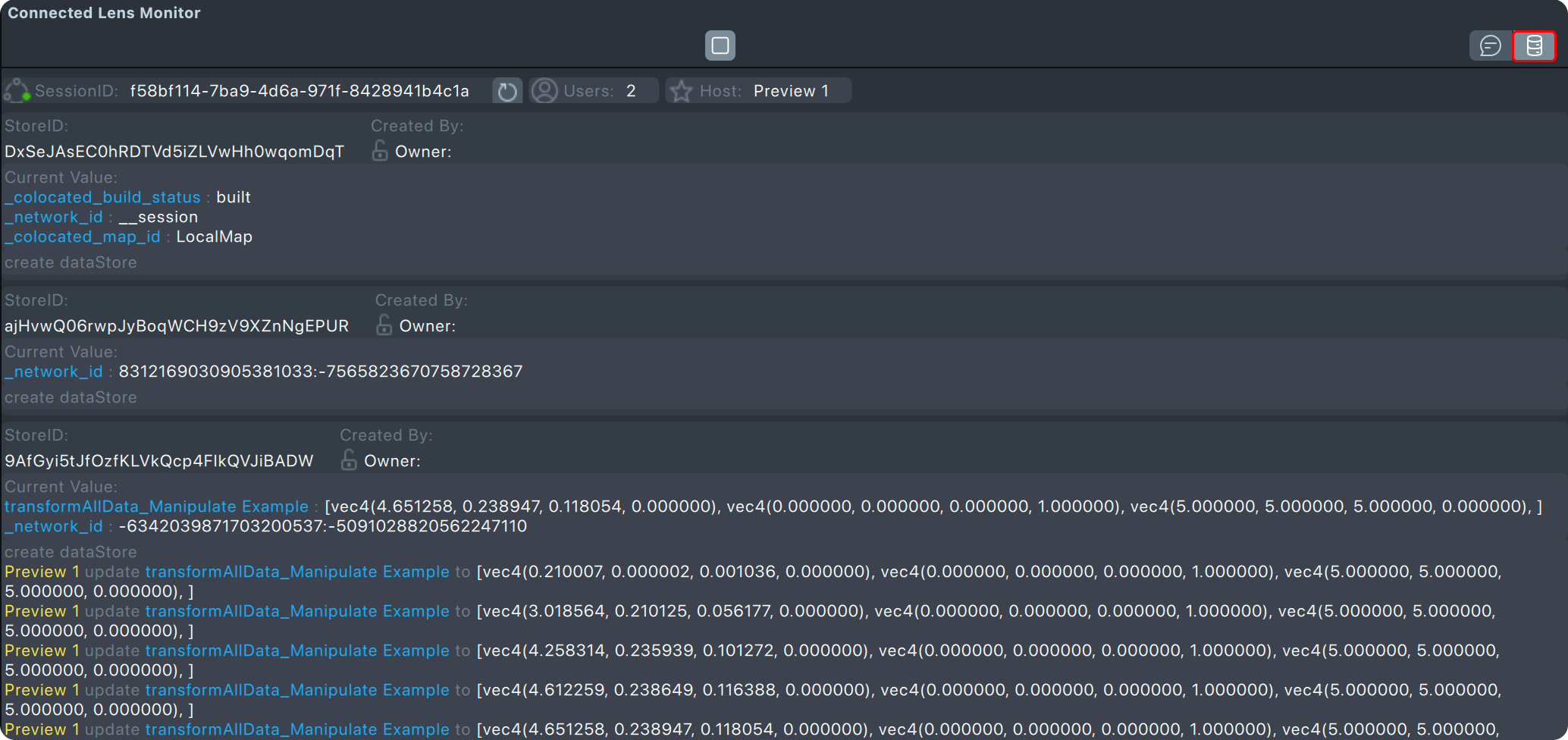 With Realtime Store Button selected, you can use the Connected Lens Monitor to check all of the storage values on a datastore. If the storage values changed, and who changed them. Identify the Prefab instantiated by each Preview window, see who owns it, and see the network ID / values associated with the store.