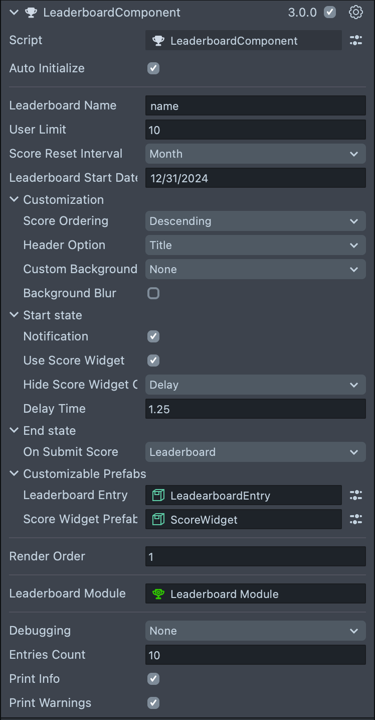 Auto Initialize - When enabled, the leaderboard initializes automatically on first frame using the parameters defined in the Inspector. If disabled, manually call:
