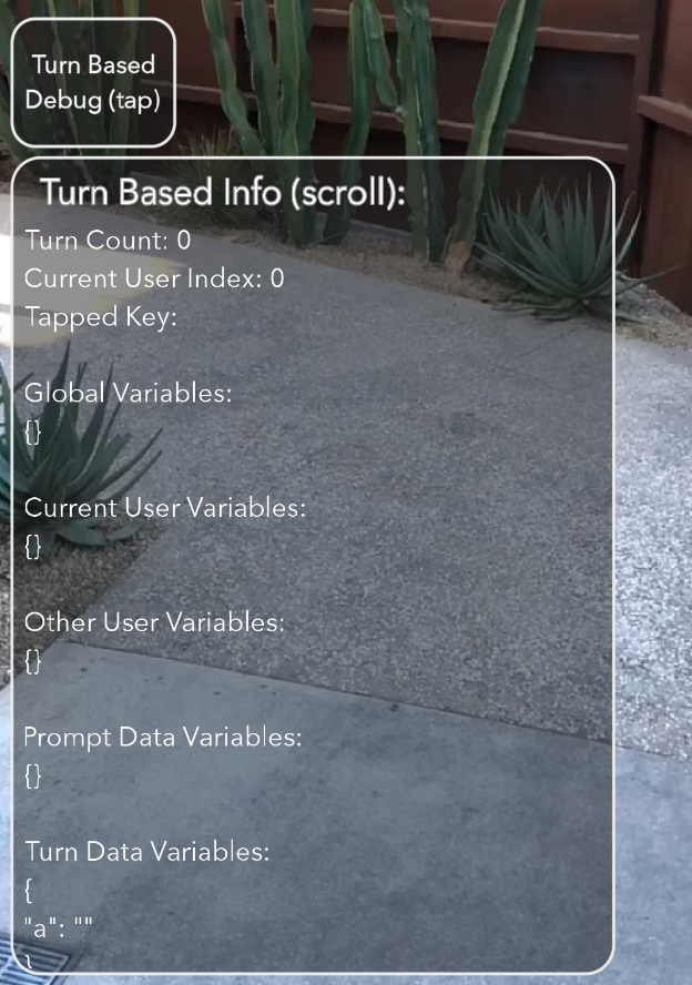 Enable Show Debug View to see a live overlay of current user, turn count, tapped key, variables, and tappable areas.