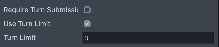 | Turn Limit | Max number of turns (used if Use Turn Limit is enabled). |