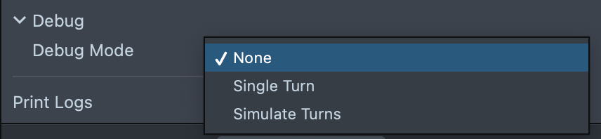 | Debug Mode | Choose: None, Single Turn, or Simulate Turns. |