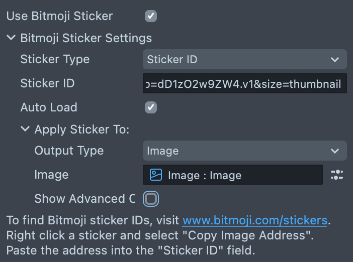 | Sticker ID | A custom Bitmoji sticker id can be entered to specify the exact sticker to use. |
