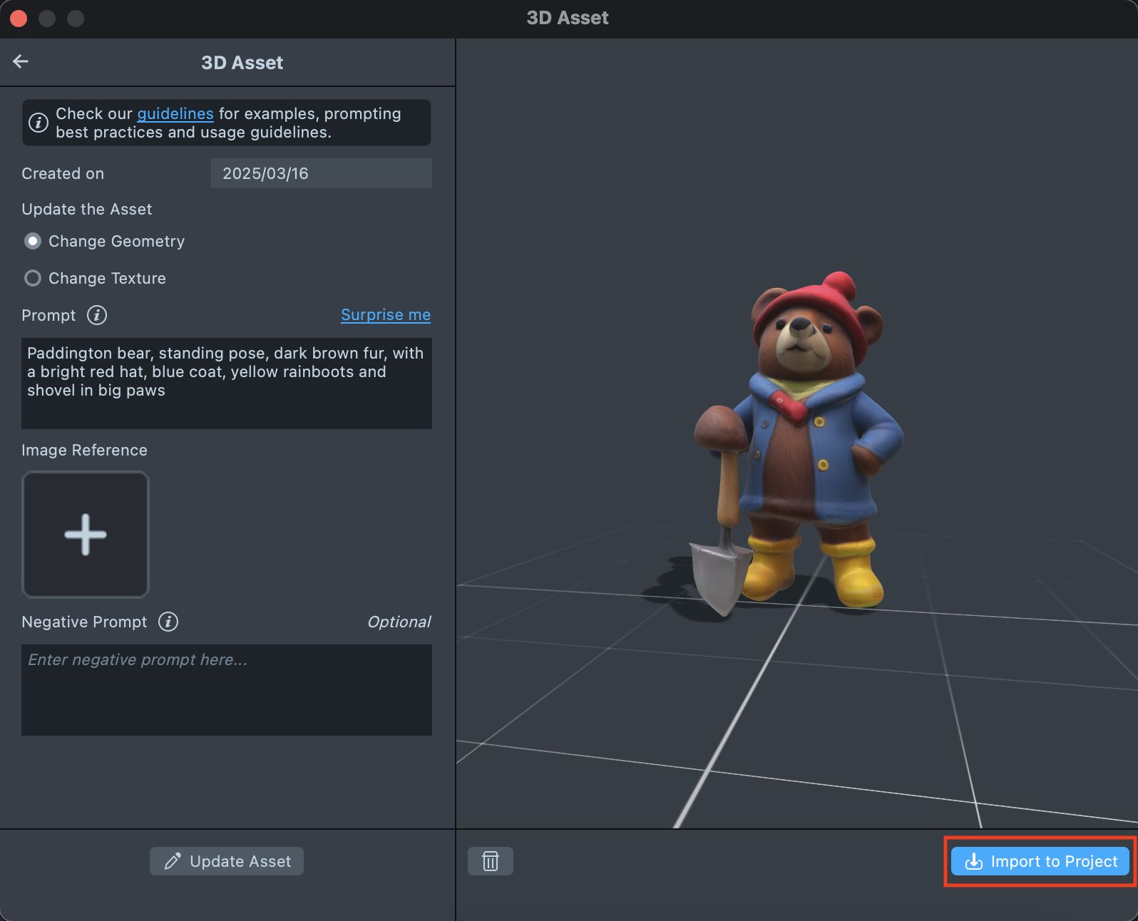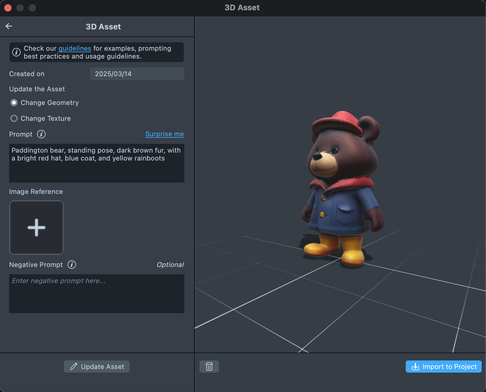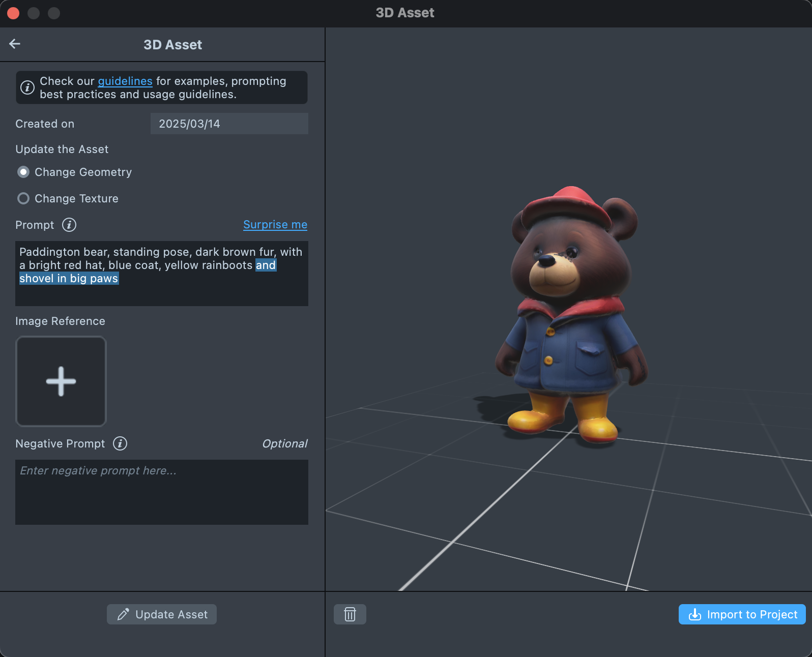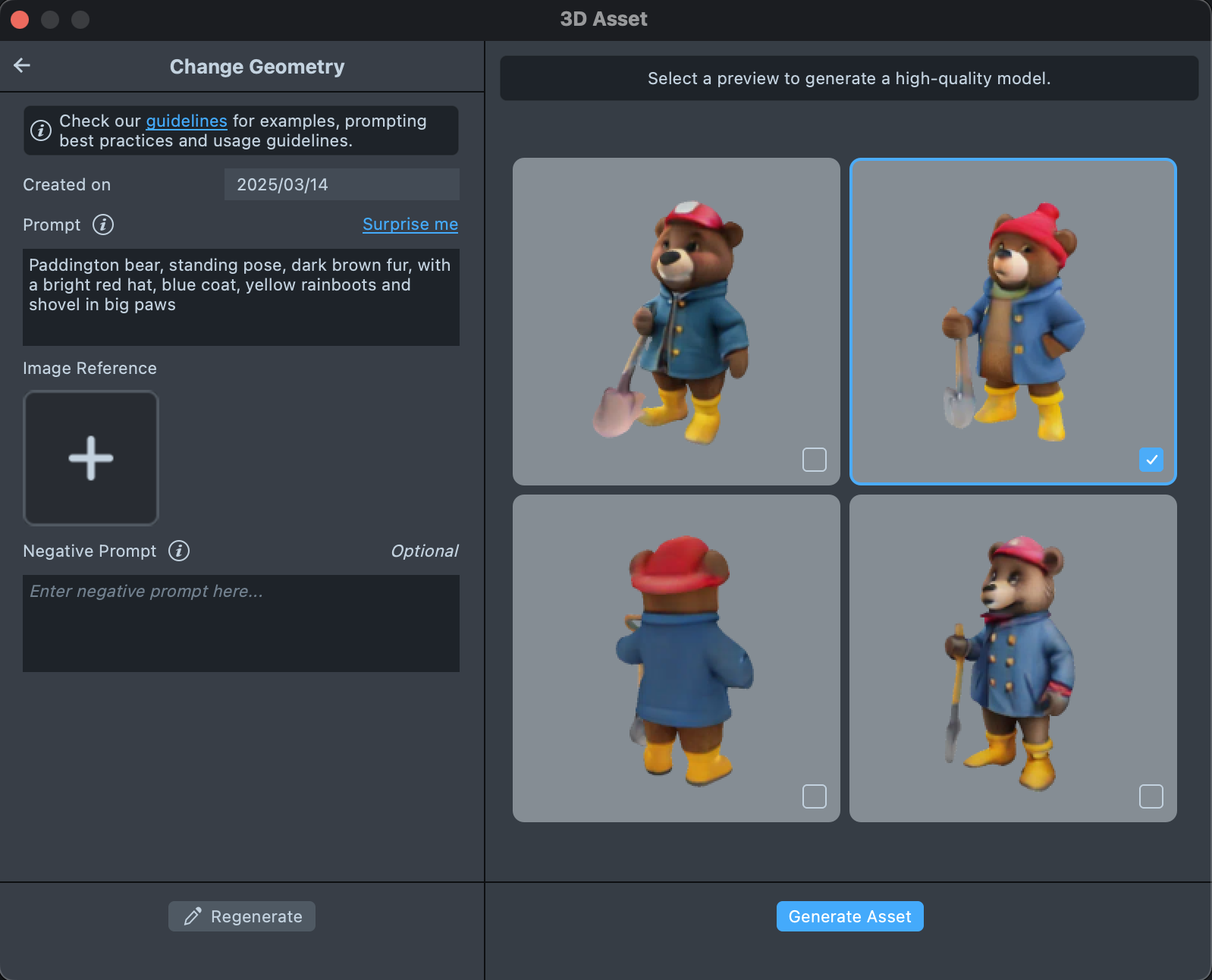 - You can adjust the asset by changing Geometry or Texture. Add more details to the prompt field, add images or adjust other settings.
