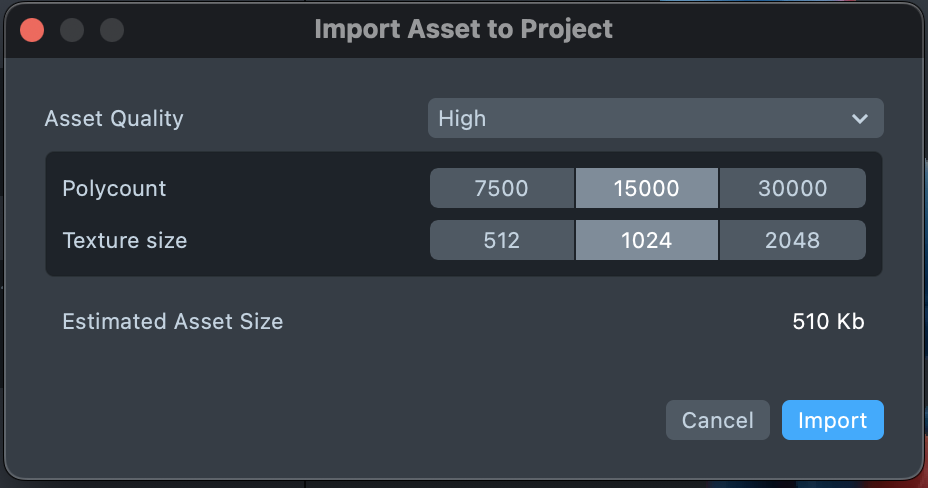 Select the quality of your 3D asset, keeping the asset size in mind. Higher quality downloads have higher polycounts and texture sizes, but also larger asset sizes.