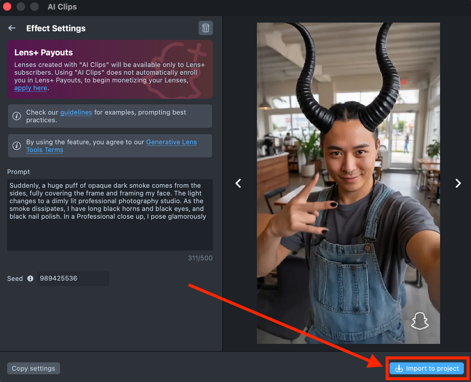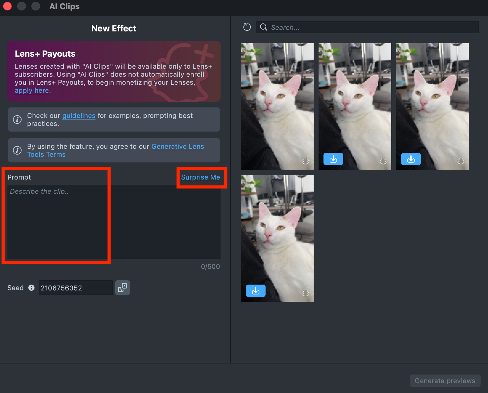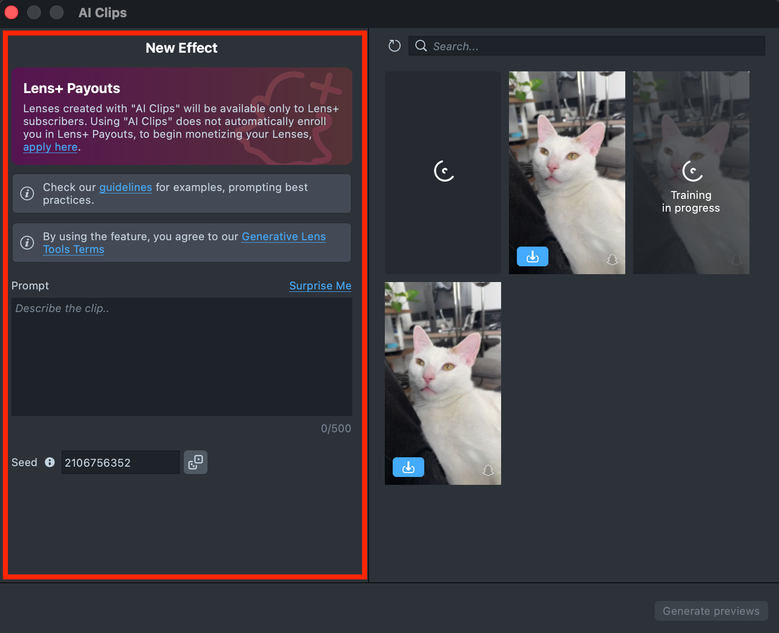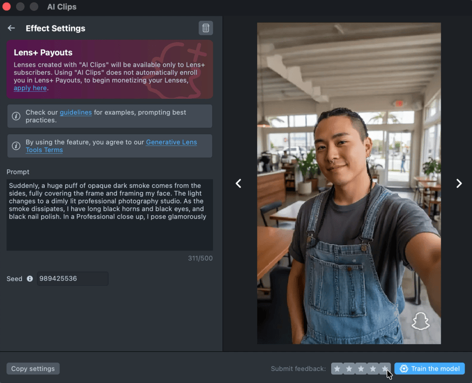 Lenses created with AI Clips plugin will be available only to Lens+ subscribers. Using AI Clips does not automatically enroll you in Lens+ Payouts, to begin monetizing your Lenses, apply here.