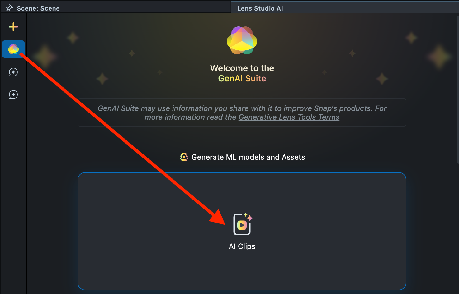 Lens Studio AIoption in the top right corner of the Lens Studio. Then, click in theGenAI Home Pagetab in the sidebar.