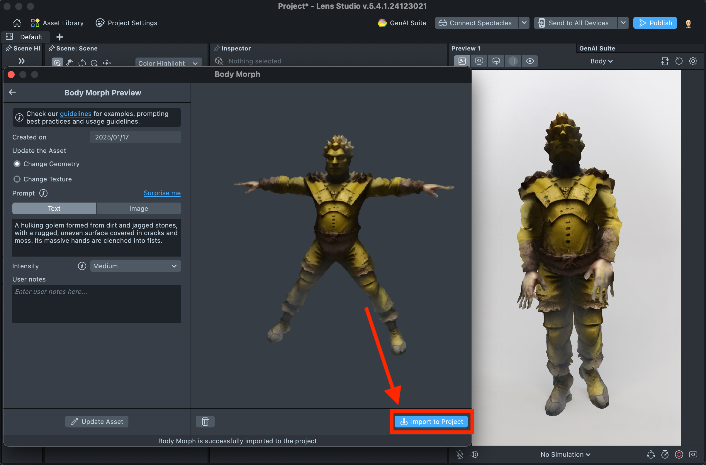 Import to ProjectButton to start creating a Lens with your Body Generator. - You can see a preview of the Lens your are building in the preview panel. Once satisfied with the result save your project and push the Lens for testing on Snapchat. Take a look at the Pairing to Snapchat guide to test your Lens on device, and the Publishing guide to learn more about sharing your creation.