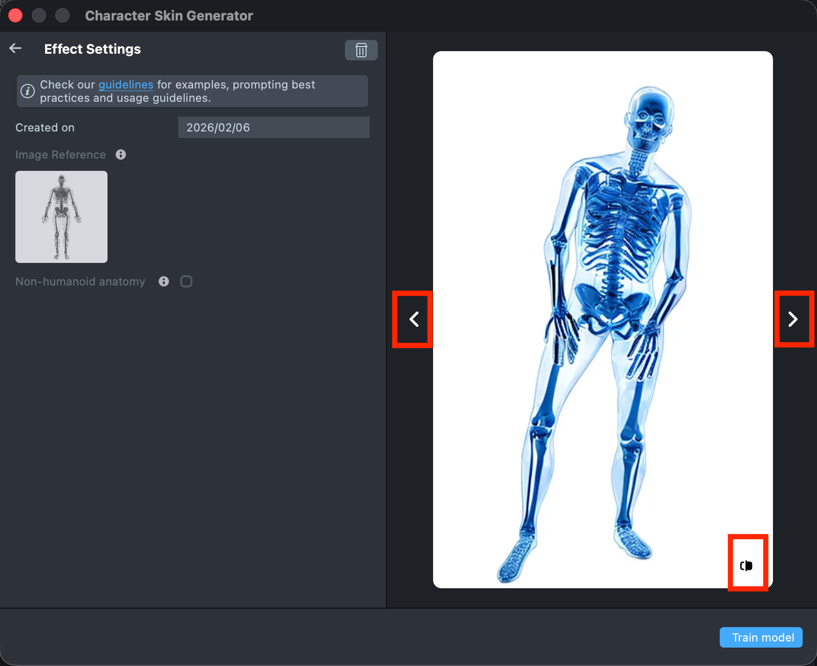 Once the preview has been generated, you can click its tile in the Gallery to open the details page. Here, you can use the arrows on the sides to preview the effect on different models. Additionally, you can click the button in the bottom-right corner to view the original image the effect was applied to.