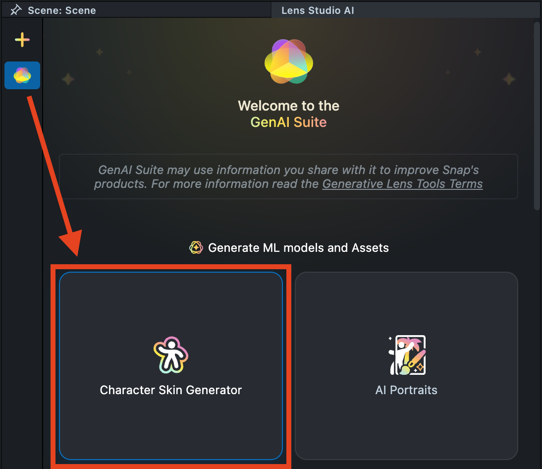 Lens Studio AIoption in the top right corner of the Lens Studio. Then, click on theGenAI Home Pagetab in the sidebar.