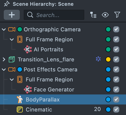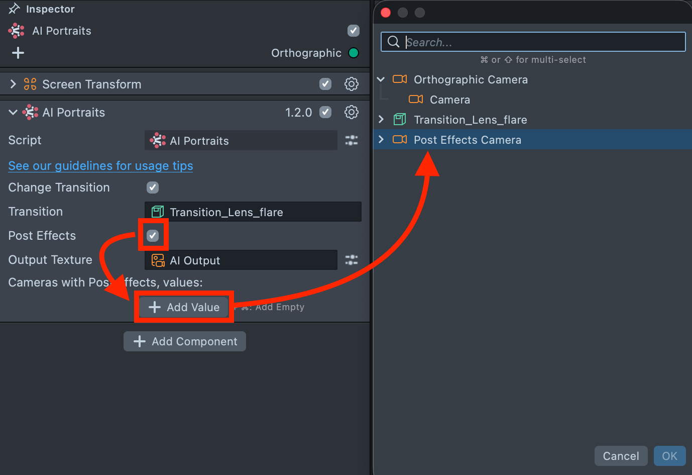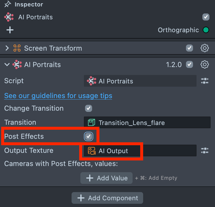 7.1. After adding and configuring your post effects, the next step is to apply them to the AI Portraits output. Earlier, you enabled the Post Effects checkbox in the AI Portraits component while locating the AI Output texture.