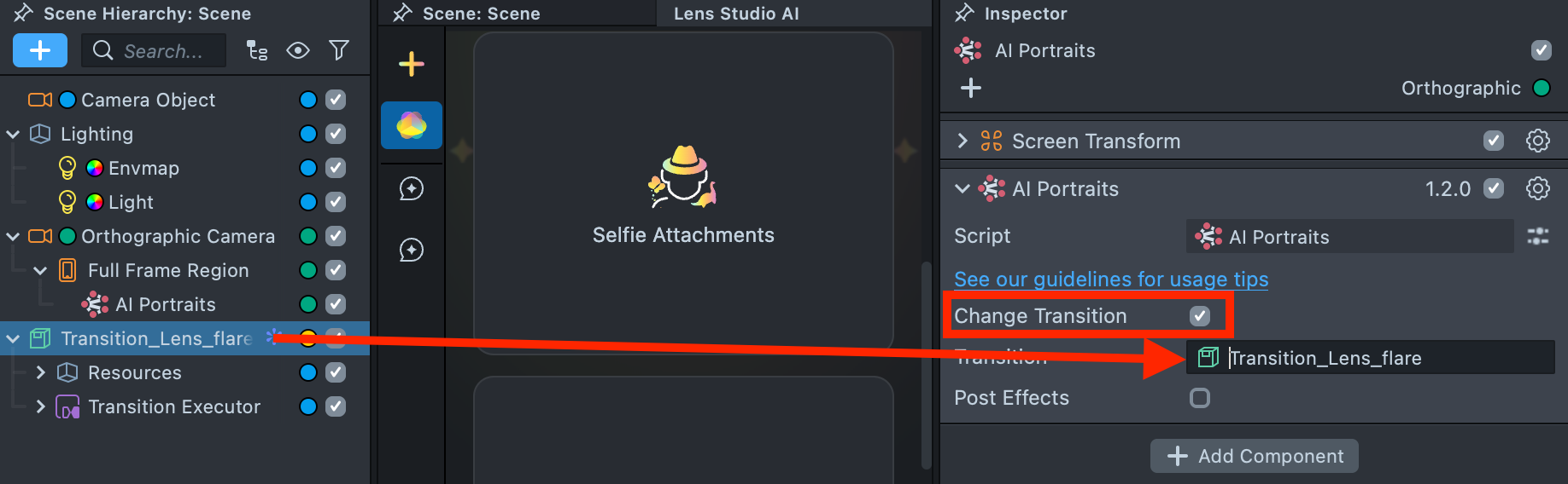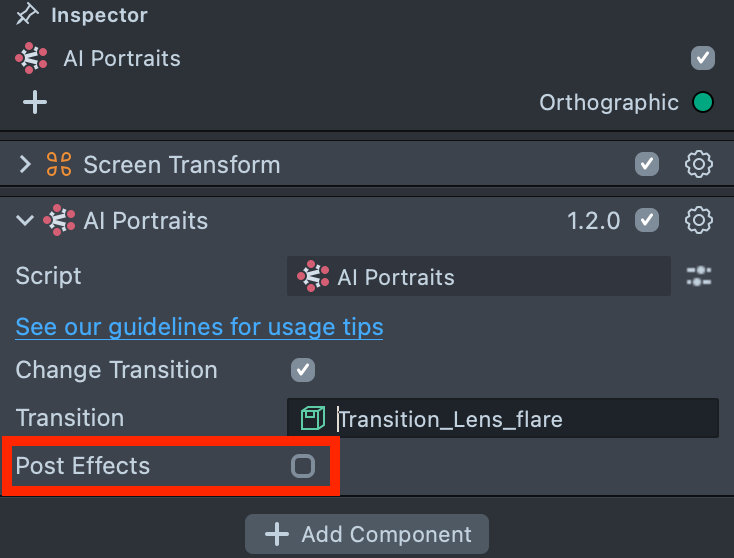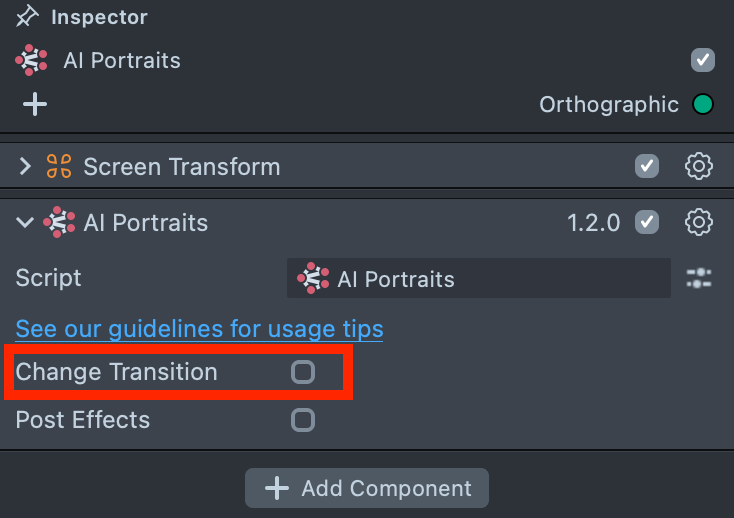 2.3. Enable the Change Transition checkbox in the AI Portraits component and link the transition’s parent object that you imported earlier.