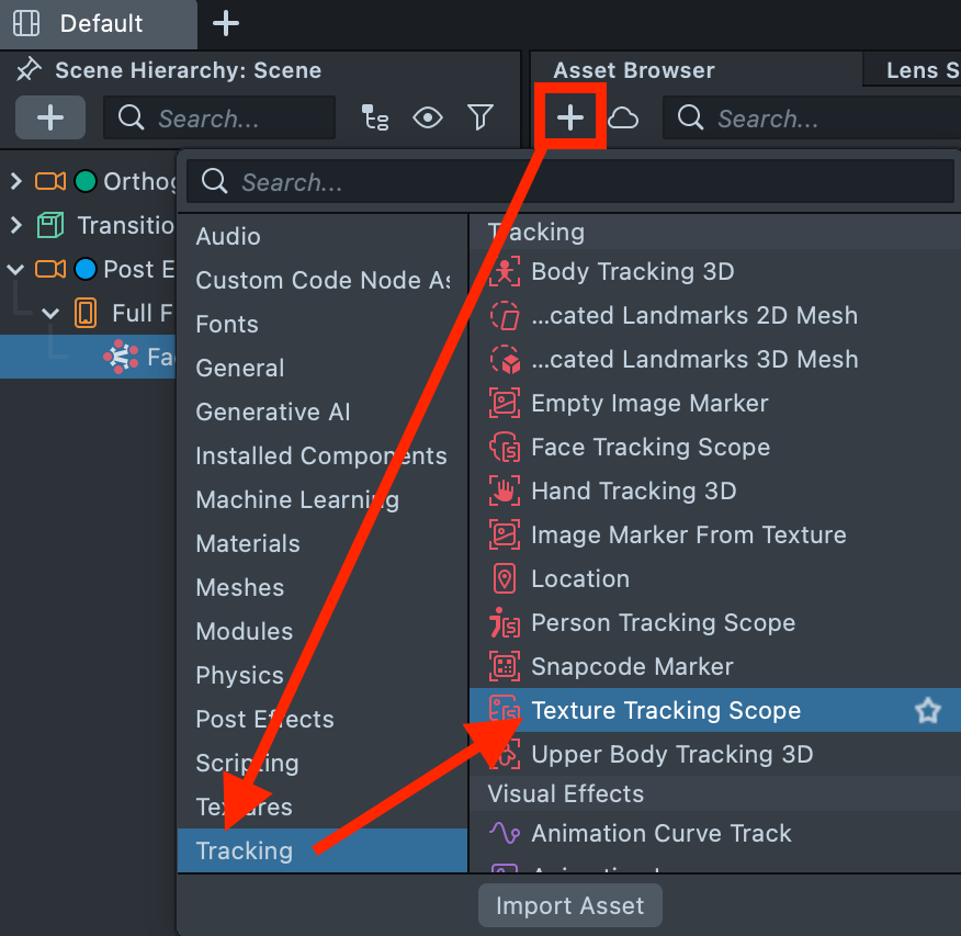 4.5. We also need to further configure the Face Generator to ensure it works correctly. To apply the Face Generator on top of the AI Portraits image, we must add an additional component to the project: the Texture Tracking Scope. To add it, click the + button in the Asset Browser, navigate to the Tracking category, and select Texture Tracking Scope. This is necessary for the tracking to function properly on the generated output.