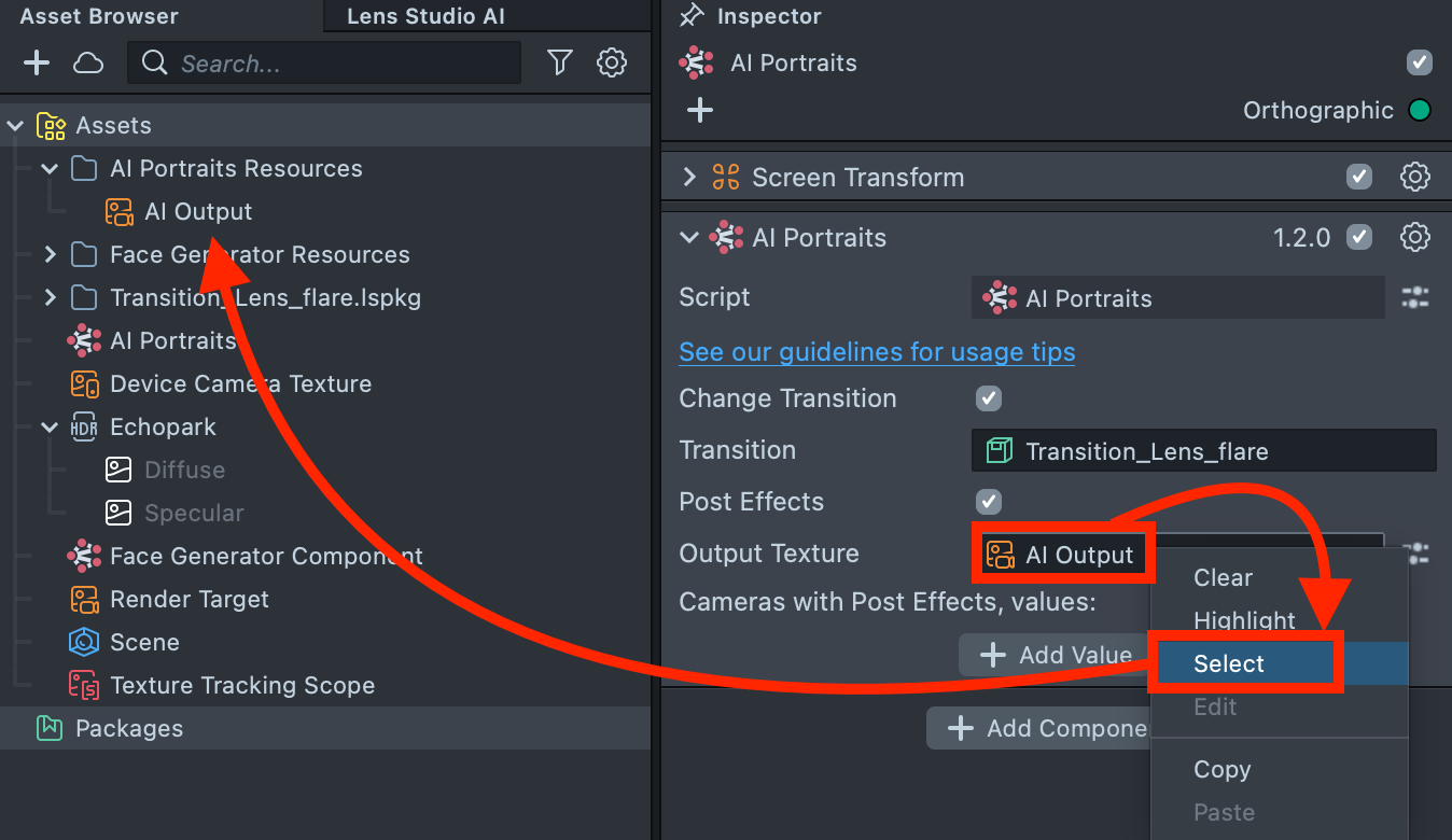 4.7. Right-click the AI Output texture field and select Select to highlight it in the Asset Browser. Take note of its location.