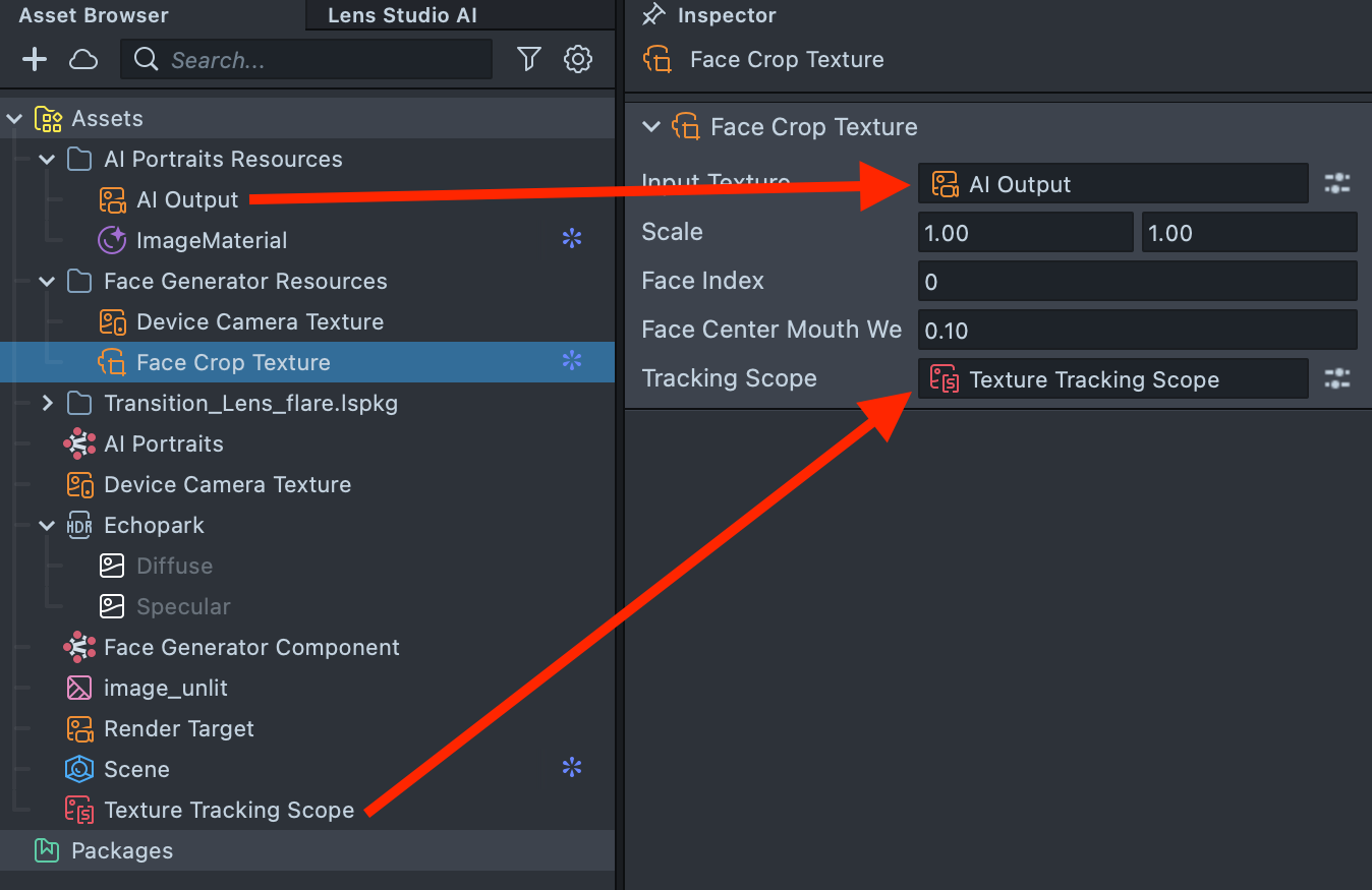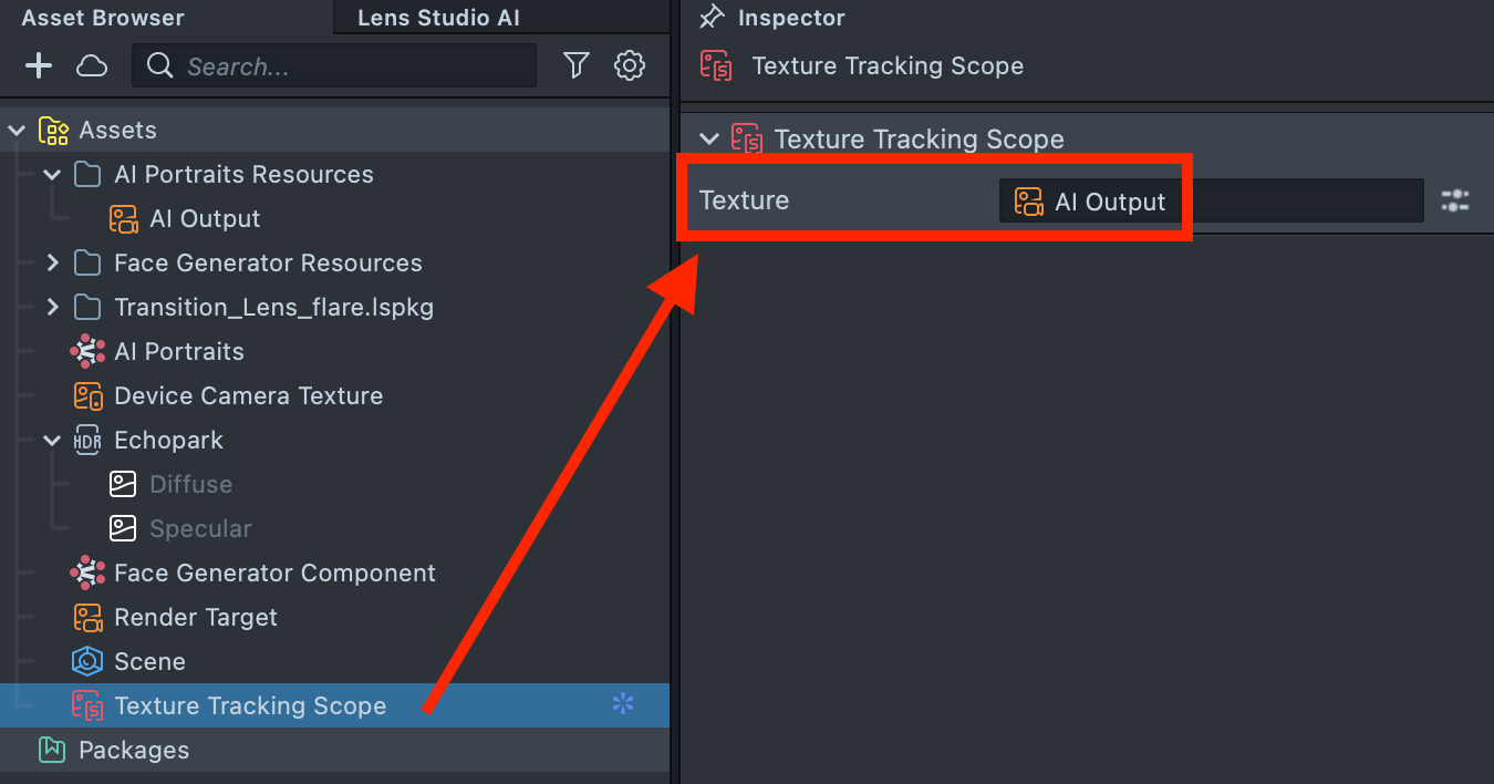 4.8. In the Asset Browser, select Texture Tracking Scope. The Texture field is currently empty: drag and drop the AI Output texture into this field.