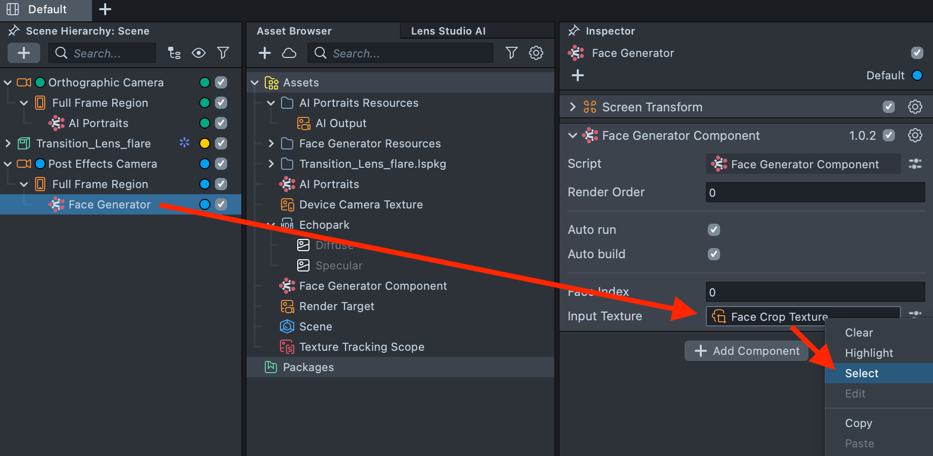 4.9. Open the Face Generator component and locate Face Crop Texture. Hover over it, right-click, and select Select.